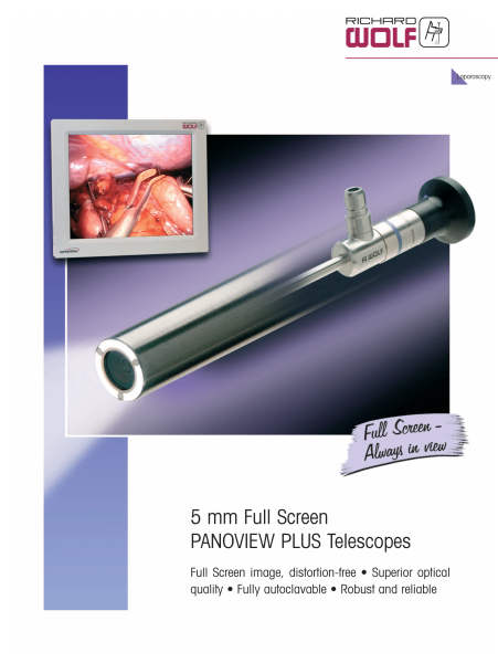 Full Screen According to the "less-is-more" principle and despite an external diameter of "only" 5.3 mm, our new PANOVIEW PLUS telescope provides bright, distortion-free, Full Screen images comparable with images produced by a 10 mm telescope! R Superior Optical Quality For many years, we have been renowned for telescopes with brilliant illumination and bright, high-resolution images. The optical qualities of R. WOLF endoscopes and their manufacturing methods are unique worldwide. R Fully autoclavable and a long service life State-of-the-art manufacturing processes ensure superior reliability for optimum performance even after many sterilization cycles.