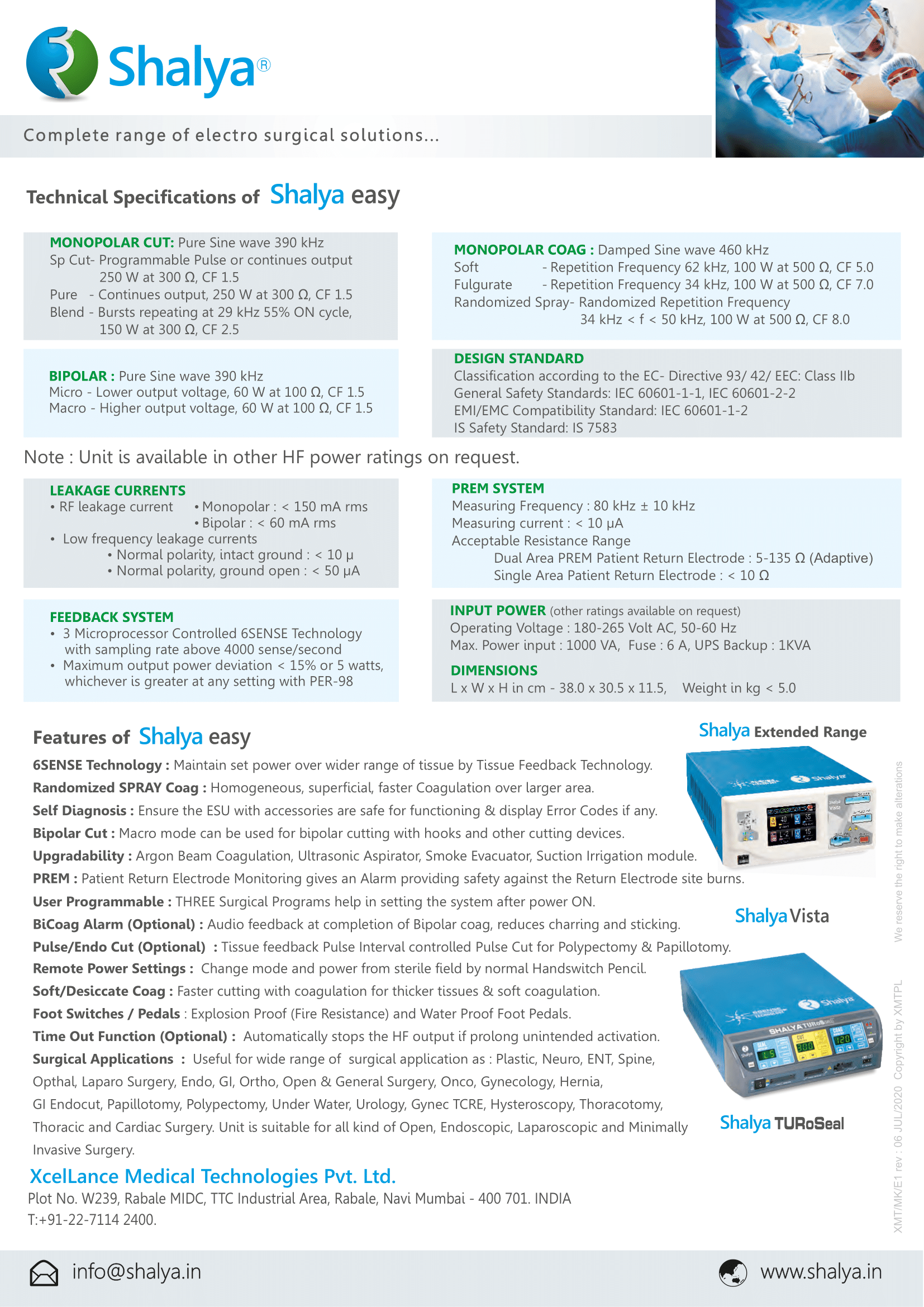 6SENSE Technology : Maintain set power over wider range of tissue by Tissue Feedback Technology. Randomized SPRAY Coag : Homogeneous, superficial, faster Coagulation over larger area. Self Diagnosis : Ensure the ESU with accessories are safe for functioning & display Error Codes if any. Bipolar Cut : Macro mode can be used for bipolar cutting with hooks and other cutting devices. Upgradability : Argon Beam Coagulation, Ultrasonic Aspirator, Smoke Evacuator, Suction Irrigation module. PREM : Patient Return Electrode Monitoring gives an Alarm providing safety against the Return Electrode site burns. User Programmable : THREE Surgical Programs help in setting the system after power ON. BiCoag Alarm (Optional) : Audio feedback at completion of Bipolar coag, reduces charring and sticking. Pulse/Endo Cut (Optional) : Tissue feedback Pulse Interval controlled Pulse Cut for Polypectomy & Papillotomy. Remote Power Settings : Change mode and power from sterile field by normal Handswitch Pencil. Soft/Desiccate Coag : Faster cutting with coagulation for thicker tissues & soft coagulation. Foot Switches / Pedals : Explosion Proof (Fire Resistance) and Water Proof Foot Pedals. Time Out Function (Optional) : Automatically stops the HF output if prolong unintended activation. Surgical Applications : Useful for wide range of surgical application as : Plastic, Neuro, ENT, Spine, Opthal, Laparo Surgery, Endo, GI, Ortho, Open & General Surgery, Onco, Gynecology, Hernia, GI Endocut, Papillotomy, Polypectomy, Under Water, Urology, Gynec TCRE, Hysteroscopy, Thoracotomy, Thoracic and Cardiac Surgery. Unit is suitable for all kind of Open, Endoscopic, Laparoscopic and Minimally Invasive Surgery